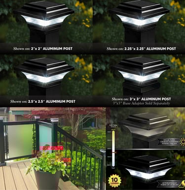 The modern yet elegant TG Solar Post Caps offer a clean contemporary design that is unequalled in performance. Its rugged cast aluminum construction, NEVER PAINT AGAIN. The TG Solar Post Cap was specifically designed for use with wood, steel or aluminum posts. Will fit over four post sizes – 3" x3", 2.5”x2.5”, 2.25”x2.25” and 2”x2”.